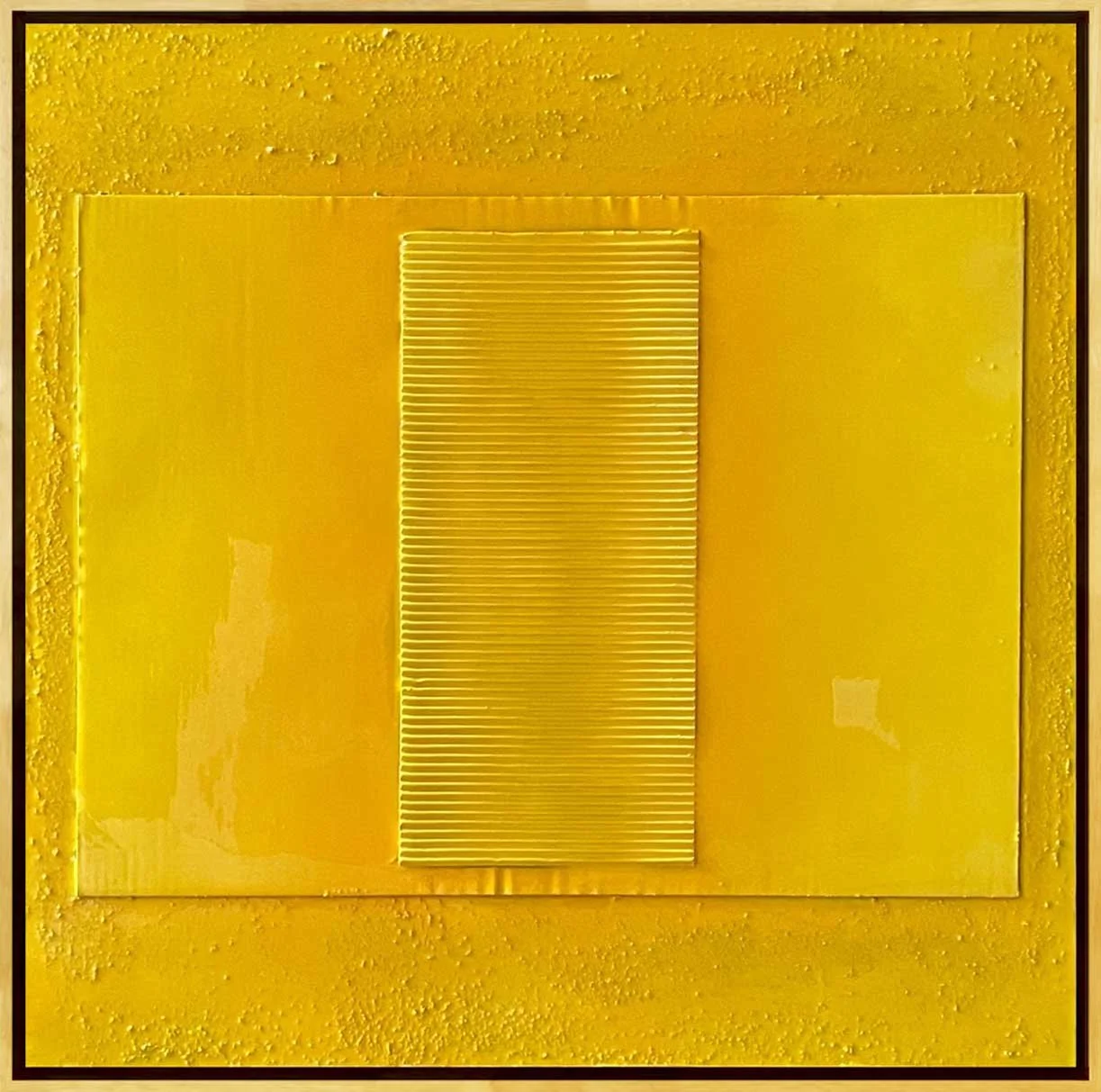 Handcrafted with precision, its surface is built up from recycled card and mixed media, then finished with a glossy, reflective resin that amplifies its brilliance. A work that feels both grounding and expansive, it captures the quiet power of light and energy in motion.